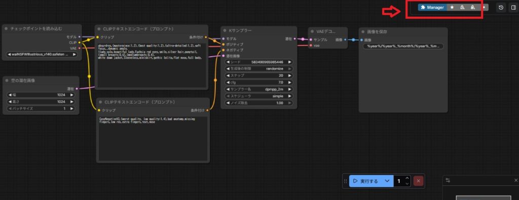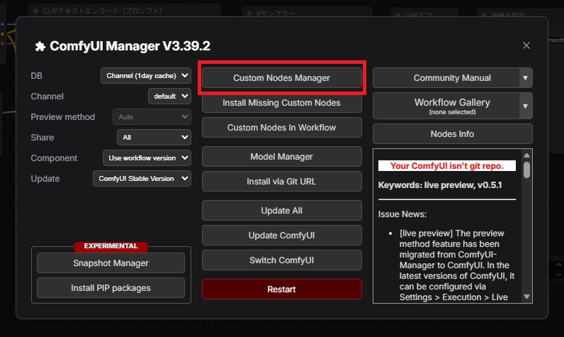 1.「Manager」→「Custom Nodes Manager」をクリック