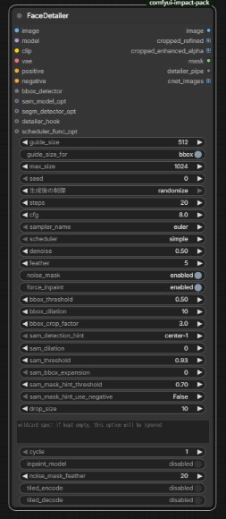 FaceDetailerのノードを見て項目が多すぎてちょっと引きましたが、安心してください。設定項目はほぼデフォルトでラインを繋ぐだけです。