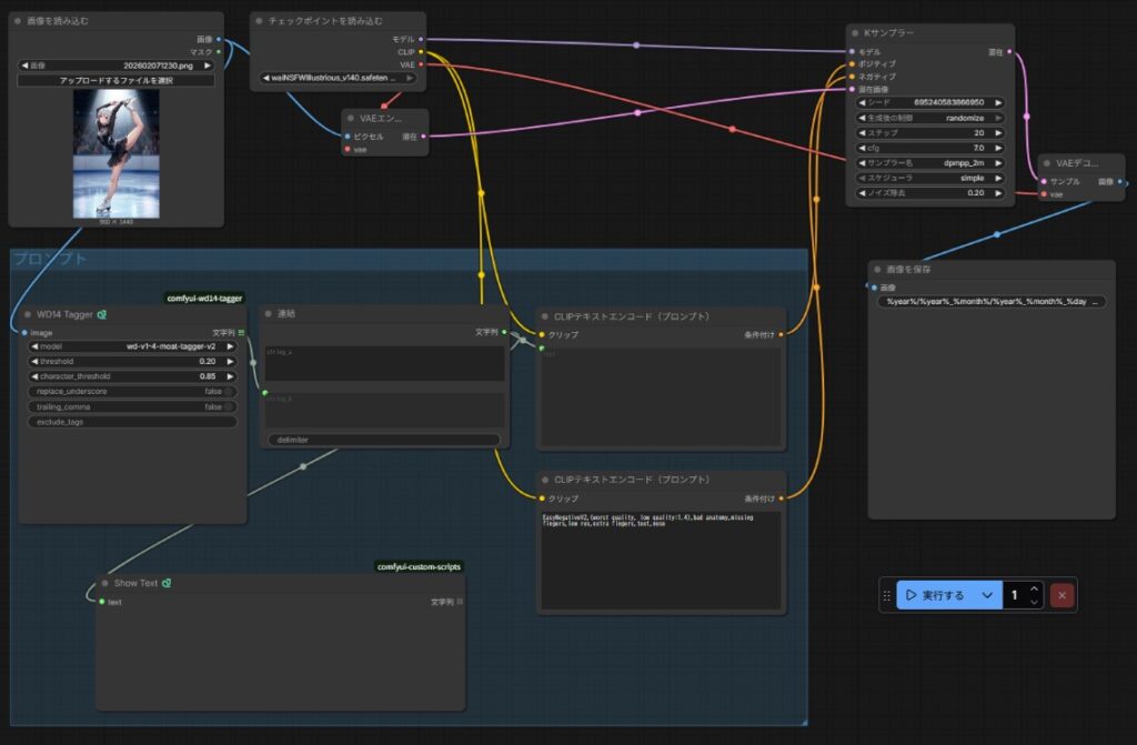「元の画像に何が描かれているか、単語を調べるのが面倒」という悩みを解決するのが、AIによる画像解析ノード 「WD14 Tagger」 です。これを使えば、画像を読み込むだけでAIが自動的にプロンプトを作成してくれます。